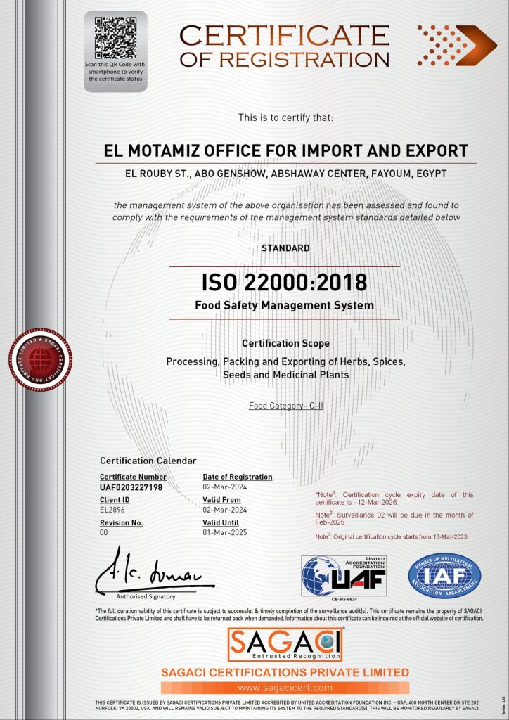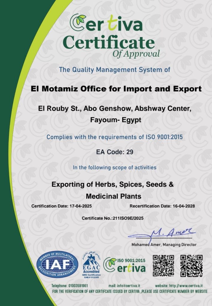 Elmotmiz Herbs is proud to hold several international quality certifications, ensuring our commitment to product excellence.
